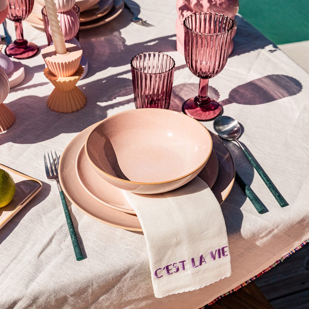 Un service en grès, disponible en 3 couleurs : Gris, Rose et Vert, très polyvalent, car en plus des pièces de format circulaire pour le quotidien, il comprend également une assiette rectangulaire et une mini assiette, parfaites pour un repas de sushi.
