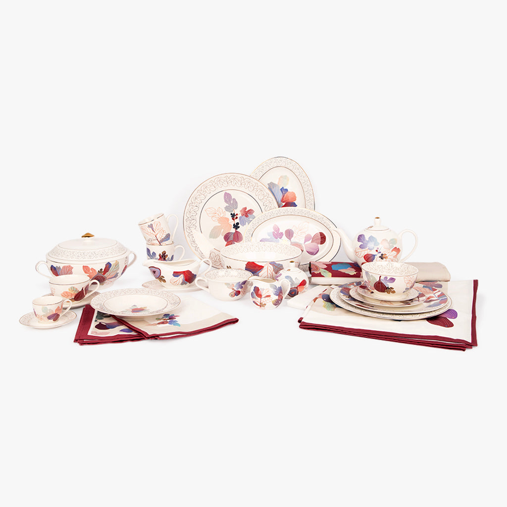 Ayant cette symbolique si riche, notre service de fête s’inspire de ses feuilles et fruits, avec des illustrations numériques riches en dégradés de couleurs exubérantes, et le résultat sont des jardins immersifs surréalistes avec des touches métalliques dorées, apportant tout le raffinement que les festivités méritent.
